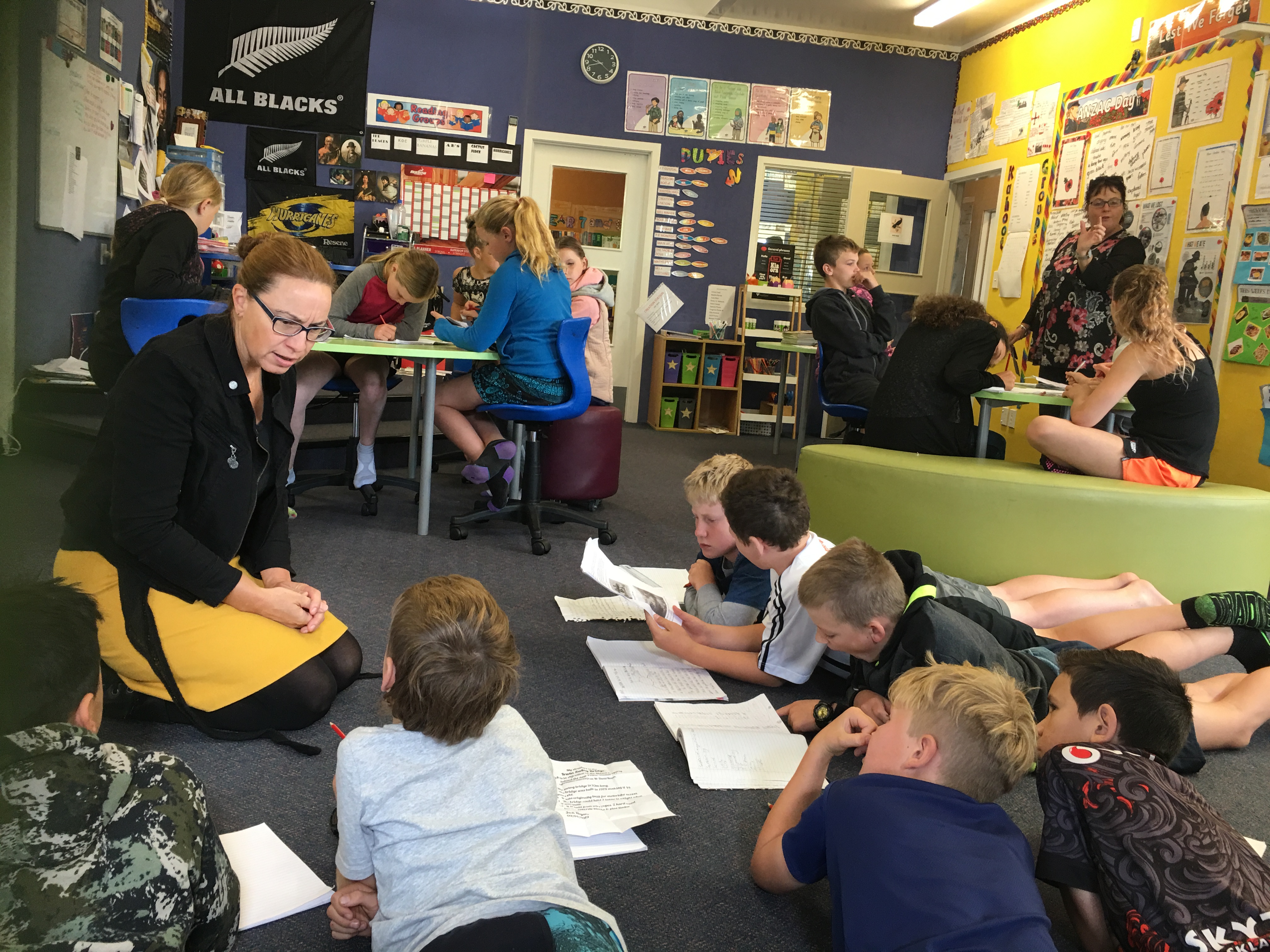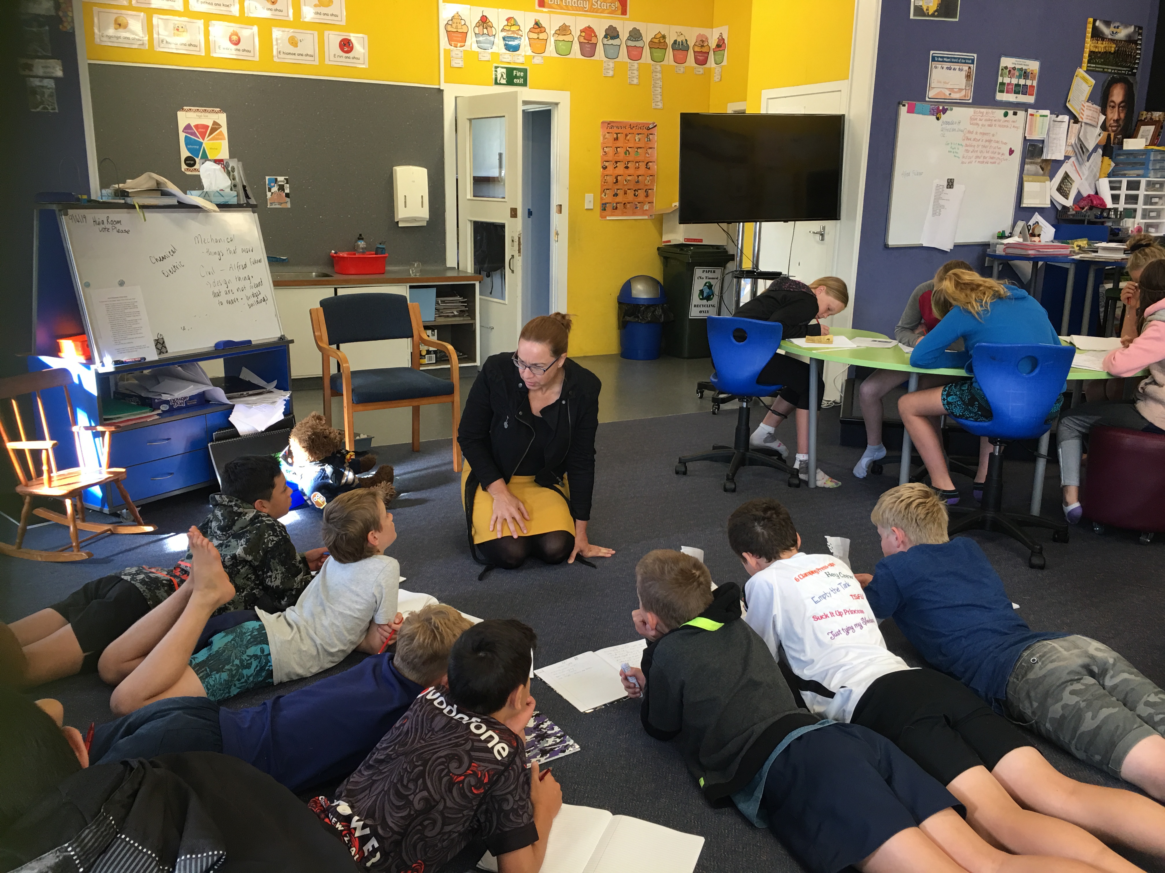 On Tuesday 9th April, as part of my Kaiparoro residency, I was fortunate enough to visit the Years 6-8 children in Huia Room at Alfredton School. It was a glorious blue sky morning! I was welcomed to Huia Room by teacher Brenda O’Donnell and introduced by Chris Daniell from NZ Pacific Studio, who was also my lovely driver for the day.