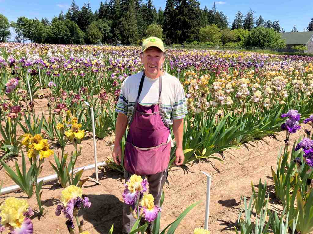 - Oregon, USA – to visit and interview renowned iris breeders Thomas Johnson (that’s him in the photo – he’s continuing Barry Blyth’s work) and Keith Keppel (who showed me some of Jean’s breeding notebooks – wow!), and to visit Schreiner’s Iris Gardens (they were Jean’s US distributors for many years).